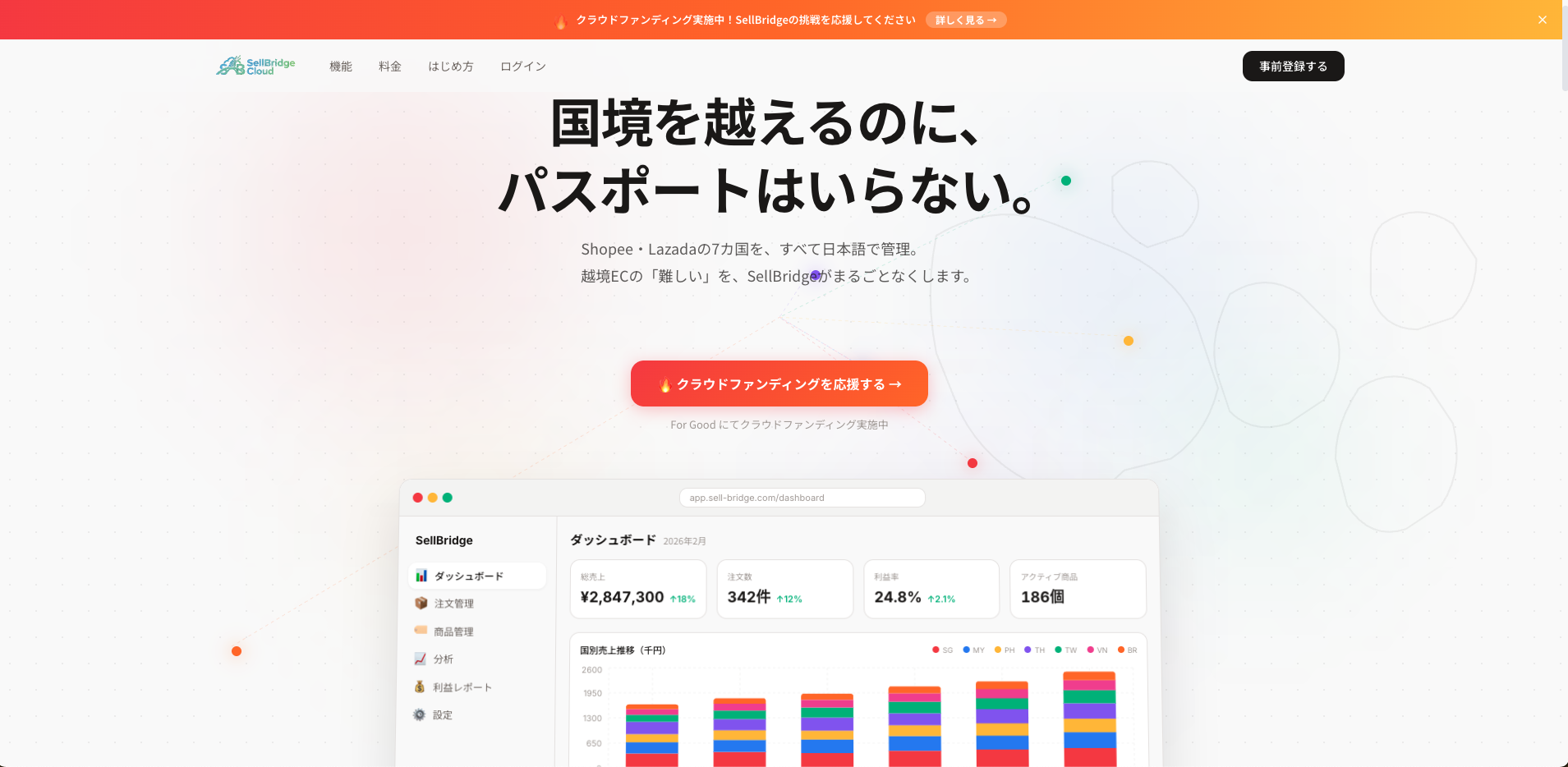 マレーシアでの駐在経験を活かし、日本製品の越境ECを展開する株式会社Darumad(COO:青木 勝利)は、誰もが簡単に海外市場へ挑戦できる環境を作るため、独自開発の管理プラットフォーム『SellBridge Cloud』の開発と実践型コミュニティの立ち上げを目的としたプロジェクトを開始しました。募集期間は2026年3月7日(土)~4月6日(月)で、目標金額は150万円を目指します。