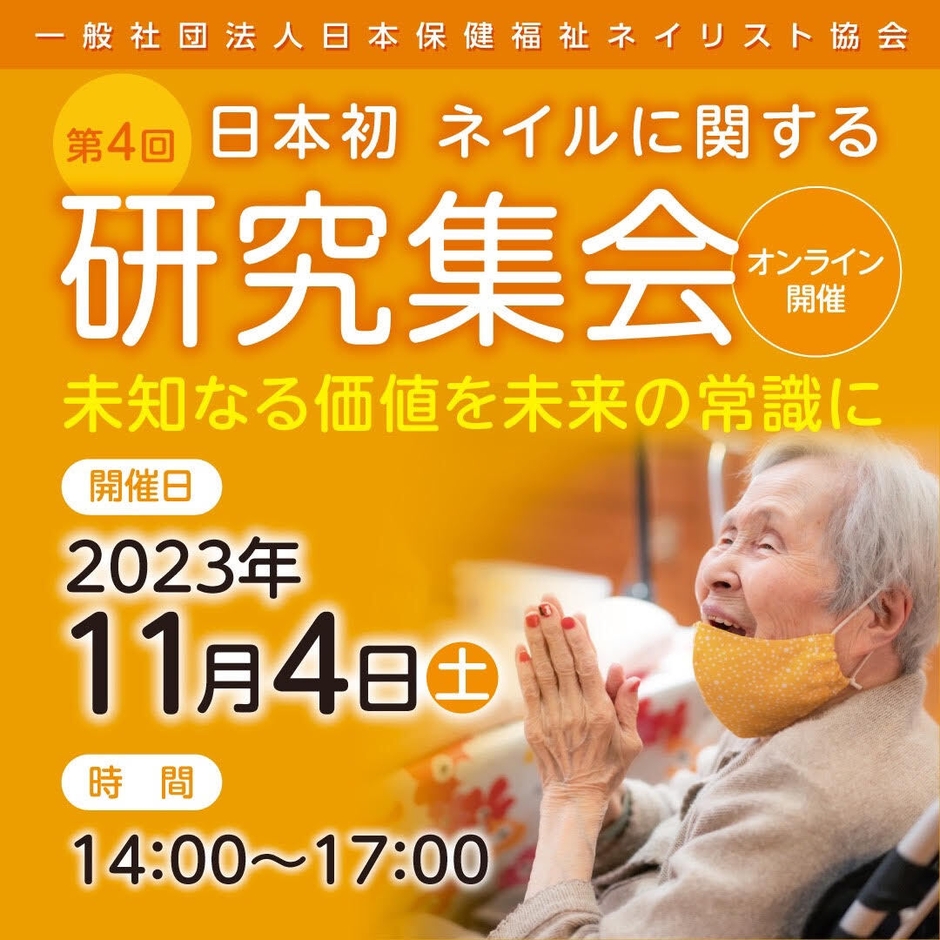 一般社団法人 日本保健福祉ネイリスト協会(理事長:荒木 ゆかり)は、2023年11月4日(土)に第4回(学術)研究集会をオンライン開催いたします。