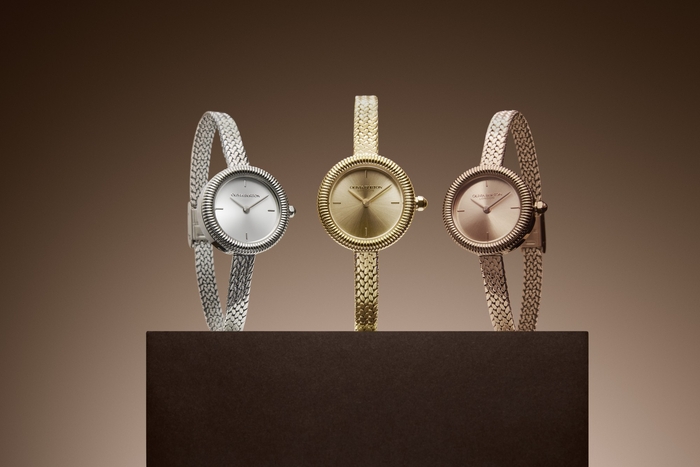 ブランドのアーカイブにあるヴィンテージデザイン、そしてオリビア・バートンのシグネチャーであるグログランリボンからインスピレーションを得た特別なシリーズです。20mmの小ぶりなケースには、繊細な“ツイスト”ディテールを施したテクスチャードベゼルを採用。ダイアルにはトーナルカラーのサンレイ加工を施し、シルバー、ゴールド、ローズゴールドの3種類をご用意。控えめなインデックスと組み合わせ、洗練された手元を演出します。ヴィンテージ感漂うメッシュストラップと組み合わせることで、クラシックとコンテンポラリーが美しく融合したミニウォッチが完成しました。