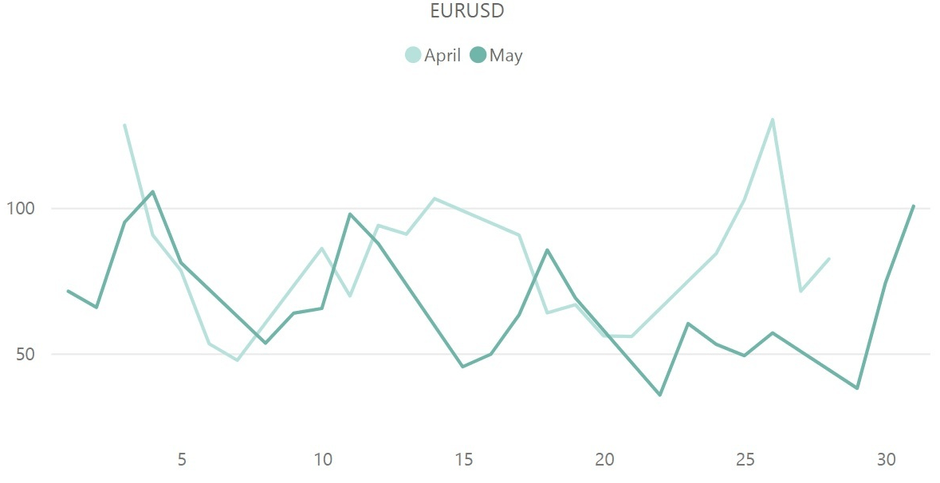 ユーロドル(EUR/USD)の4月と5月のボラティリティ推移を比較した上記のグラフから、5月のユーロドルは4月に比べてボラティリティが縮小したことが確認できました。1日当たりの平均ボラティリティは4月の82.3pipsに対して5月は68.2pipsとなり、ボラティリティが恵まれなかった4月よりもさらに縮小しています。最大ボラティリティに関しても、4月の130.2pipsに対して5月4日の105.5pipsが最大であり、先月比で縮小しています。5月4日はECB金利や米国の金利発表、FOMCなどの重要なファンダメンタルズが発表された日付で、ボラティリティが一時的な拡大を見せるものの、月末まで活気づくことはありませんでした。