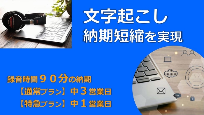 音声認識システムを活用することにより、録音時間90分の場合、【通常プラン】の納期は中3営業日、【特急プラン】は中1営業日で提供可能となりました。