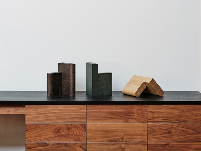 素材には、国産のクリ材を使用。カリモク家具の製造工程で発生する短尺材は家具用材として使うには短く、普段は表からは見えない内側に利用されています。今回のブックエンドではそういった短尺材を主材として用いることで、日本の森から出材する個性豊かな木材を余すところなく有効に活用しています。