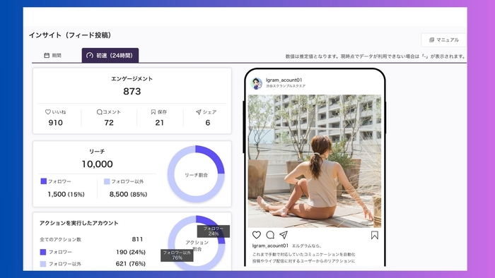 株式会社ミショナが提供するInstagram(インスタ)自動化ツール「エルグラム」では投稿済み画像・動画のキャプション・いいね・コメント・保存・シェア・リーチ・エンゲージメントの確認と分析ができます。