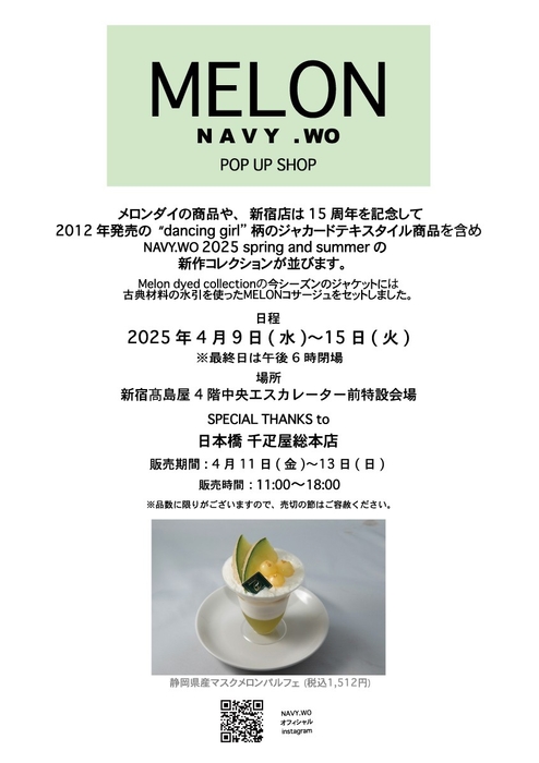 ソトデザインco.ltd(所在地:東京都世田谷区奥沢5-20-17)が運営するファッションブランドNAVY.WOがメロンの皮から抽出した染料で染められたシャツジャケットやスカートなどを販売する特設POP UP SHOPを、2025年4月9日(水)~15日(火)まで新宿高島屋にて開催。シャツジャケットには限定販売として「水引き」でつくられたメロンブローチがセットとなる特別アイテムも販売。また、4月11日(金)~13日(日)3日間(11:00~18:00)は同会場にて『日本橋 千疋屋総本店』のスイーツ、静岡県産マスクメロンパルフェも販売致します。