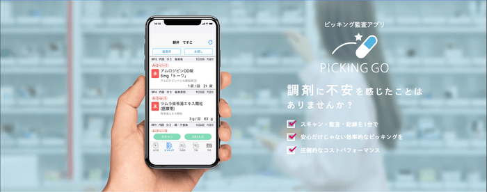 今までの監査システムが「薬品の取り間違いを防ぐ」ことだけを目的にしていたのに対し、PICKING GOは「誰でも・安心して・効率よくピッキングが行える」をコンセプトにした、まったく新しい完全クラウドタイプの次世代ピッキング監査アプリです。すでに多くの薬局に評価され、全国へ導入が進んでいます。