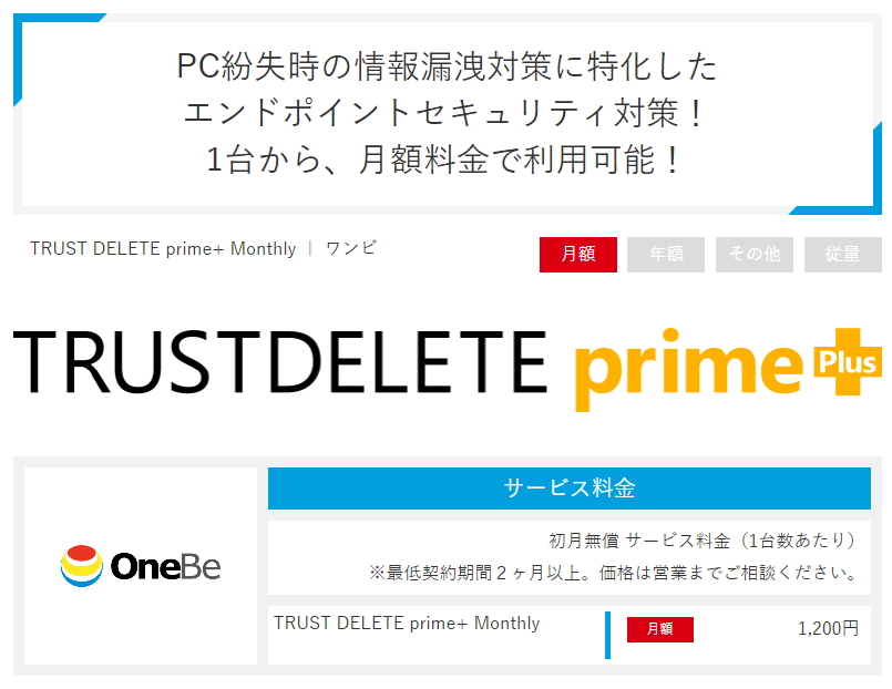 遠隔データ消去のリーダー企業であるワンビ株式会社(東京都新宿区、代表取締役社長:加藤 貴、以下「ワンビ」という)は、モバイルパソコンの情報漏えいと不正利用を防止する、安心のリモートワイプソリューションを月額でご提供する「TRUST DELETE prime+ Monthly」を、ダイワボウ情報システム株式会社(以下「DIS」という)の運営するサブスクリプション管理ポータル「iKAZUCHI(雷)」にて、販売開始したことを発表いたします。