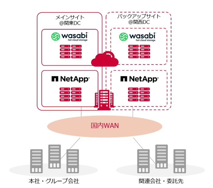 ネットアップのストレージと「Wasabi オブジェクトストレージ」をNTT Comの関東、関西のデータセンターに分散配置することでBCP対策のご要望にも対応可能です。
