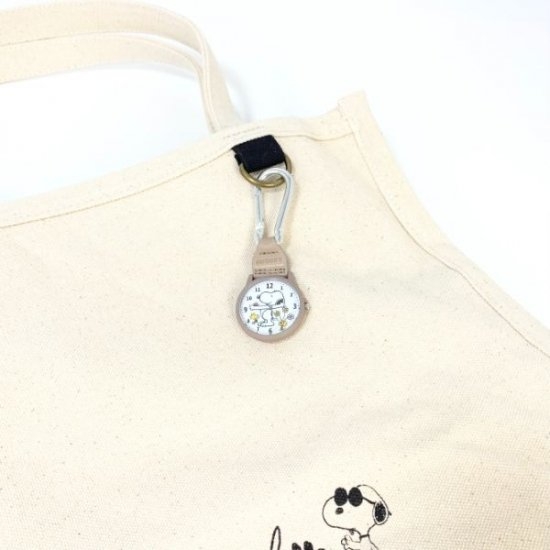 こちらはスヌーピーのカラビナウォッチ。留め具がカラビナなので、バッグやベルトに引っ掛けて簡単に装着できます。