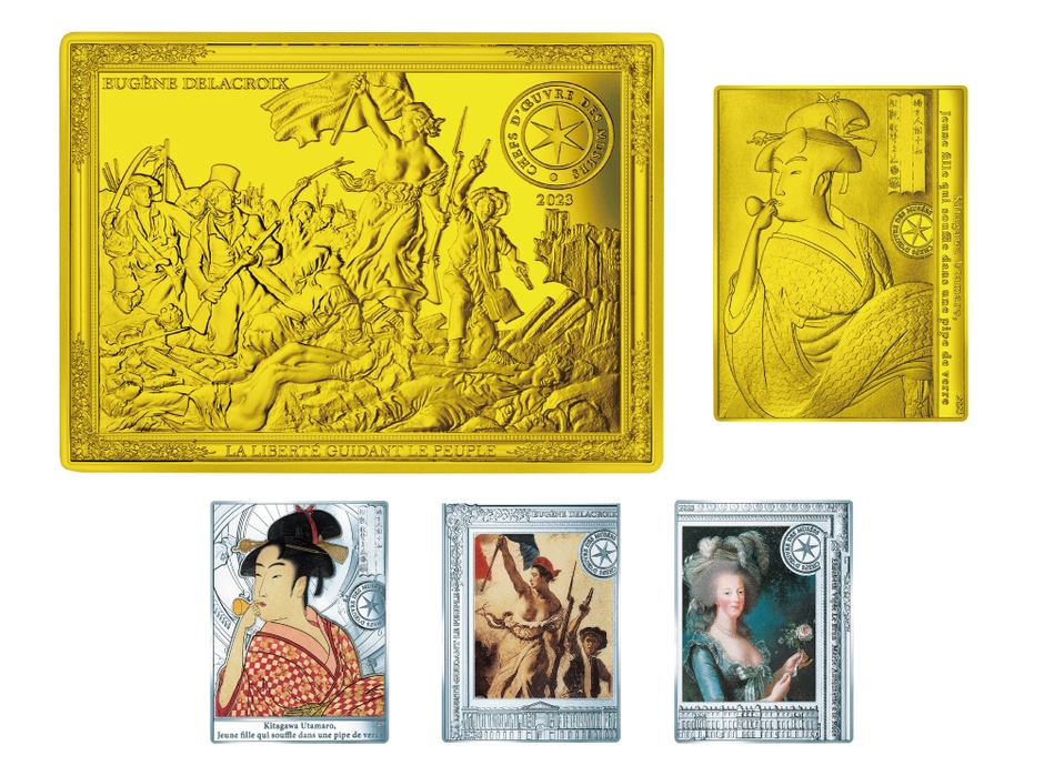 本コインは、世界最古の歴史と芸術性で定評のある「フランス国立造幣局」(モネ・ド・パリ)が鋳造・発行するもので、海外でも高い人気を誇る喜多川歌麿の浮世絵『ビードロを吹く娘』、フランス7月革命を描いたドラクロワの傑作『民衆を導く自由の女神』、18世紀を代表する女性画家ルブランの『マリー・アントワネット』の3作品がモチーフとなります。シリーズ最大となる希少な四角型の5オンス金貨(約155g)をはじめ、緻密な彫刻技術で立体的に表現された金貨、独自の彩色技術で名画をリアルに再現したカラー銀貨など、8種類をラインアップします。