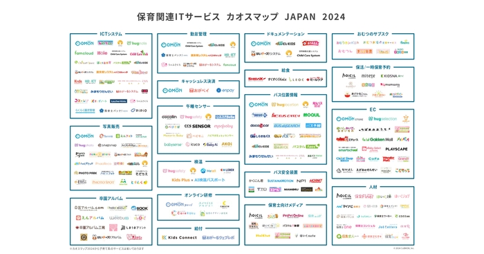 なお、今回の「カオスマップ2024」では、保育関連のITサービスのご紹介に特化させているため、子育て系のITサービスは省いております。