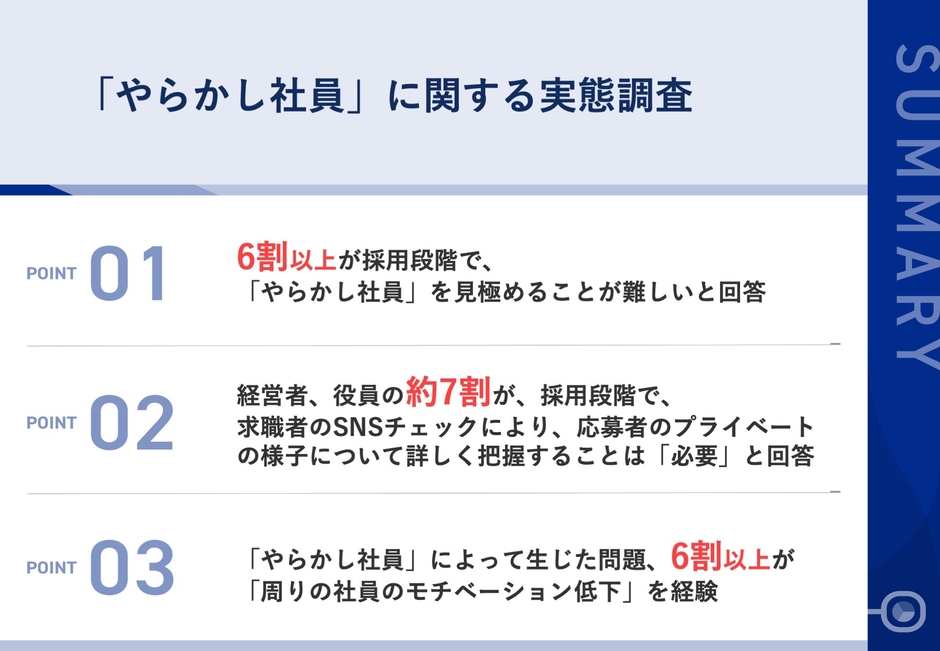 まず、勤務先の社員に「失敗を隠す」(33.7%)や「「私の仕事じゃないんで」と言う」(29.7%)といった、いわゆる「やらかし社員」の何らかの特徴を持った社員がいる企業がほとんどであることがわかり、具体的に「やらかし社員」によって生じた問題として、「周りの社員のモチベーション低下」(63.6%)や「周りの社員の業務負担増加」(51.5%)などが挙げられたことから、企業の損失につながっていることがわかりました。一方で、6割以上が採用段階で「やらかし社員」を見極めるのが難しいと回答し、その理由として「面接では本当の素が分からない」が82.0%で最も多く挙げられています。また、経営者の約7割が、採用時において応募者のプライベートな様子を把握するためにSNSのチェックが有効であると考えており、実際に、現在7.9%の企業が実施、19.8%が今後検討中としています。