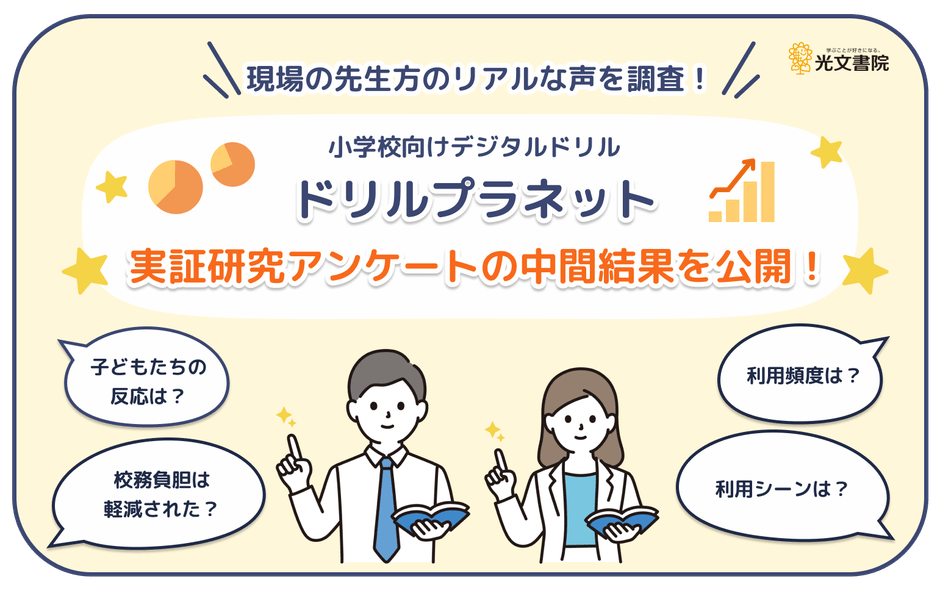 株式会社光文書院(本社:東京都千代田区、代表取締役社長:長谷川 知彦、以下「光文書院」)は、小学校向けデジタルドリル「ドリルプラネット」の実証研究参加校を対象にアンケートを実施しております。今回は、その中間結果を公開いたします。