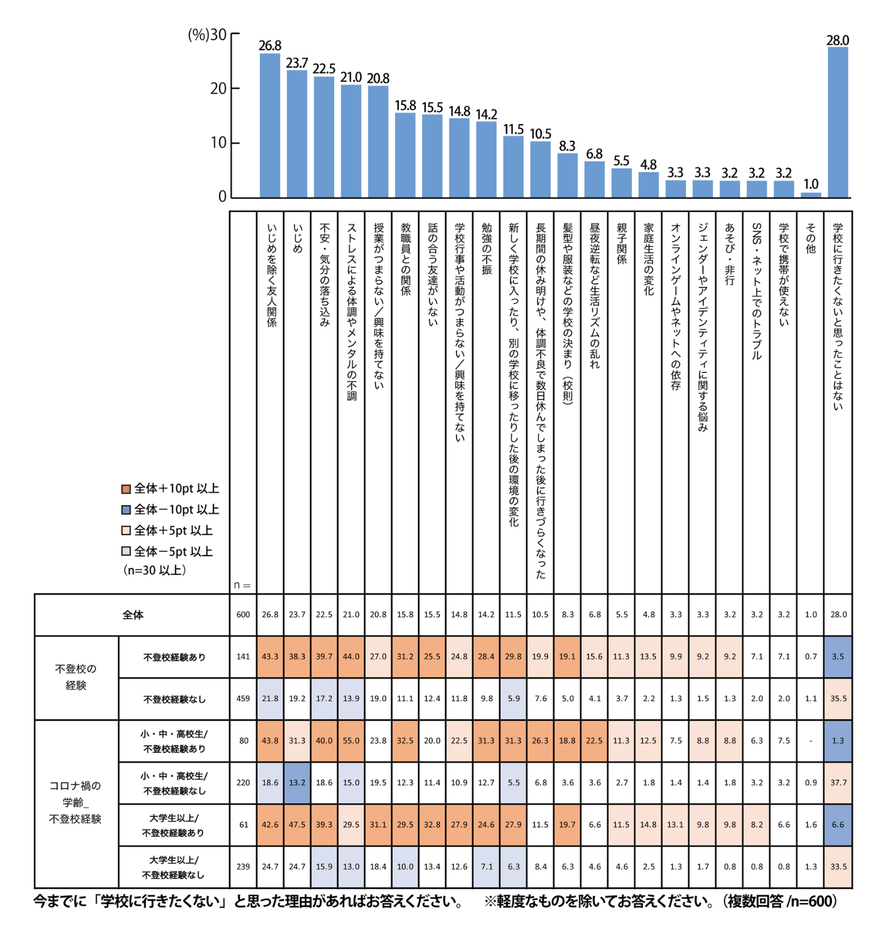 一方、大学生以上/不登校経験ありは「いじめ」「いじめを除く友人関係」「不安・気分の落ち込み」の順になっており、小・中・高校生との違いが見て取れます。