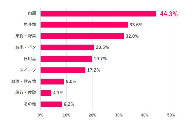 ふるさと納税の返礼品でよく選ぶものを聞いたところ、1位「肉類」44.3%、2位「魚介類」33.6%、3位「果物・野菜」32.0%で、日常で使う食品が上位を占めました。「日用品」や「旅行・体験」など、食品以外のものを選ぶ人は少数派でした。その他のコメントには、「家電」「化粧品」「寄付」などがありました。