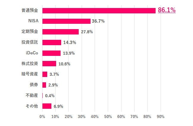 どんな方法でやっているか聞いたところ、「普通預金」86.1%がかなり多く、「NISA」36.7%、「定期預金」27.8%が続きました。「暗号資産」「債券」「不動産」などの投資をやっている人は少数派でした。