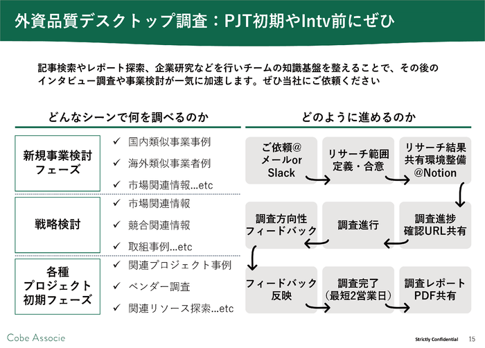 この度、新規事業チームやスタートアップに向けて、市場や国内外の企業研究のために活用頂ける「外資品質デスクトップ調査」のサービスを開始します。新規事業検討フェーズでは国内外のベンチマーク事業者深掘り調査や各種既存レポートの収集、実行に近いフェーズではベンダーのロングリスト化や取組事例調査等に活用頂けます。メールやSlackなどでご依頼を頂き、リサーチファクトはNotionページ上で随時共有、最短2週間で最終リサーチレポートを納品させて頂きます。