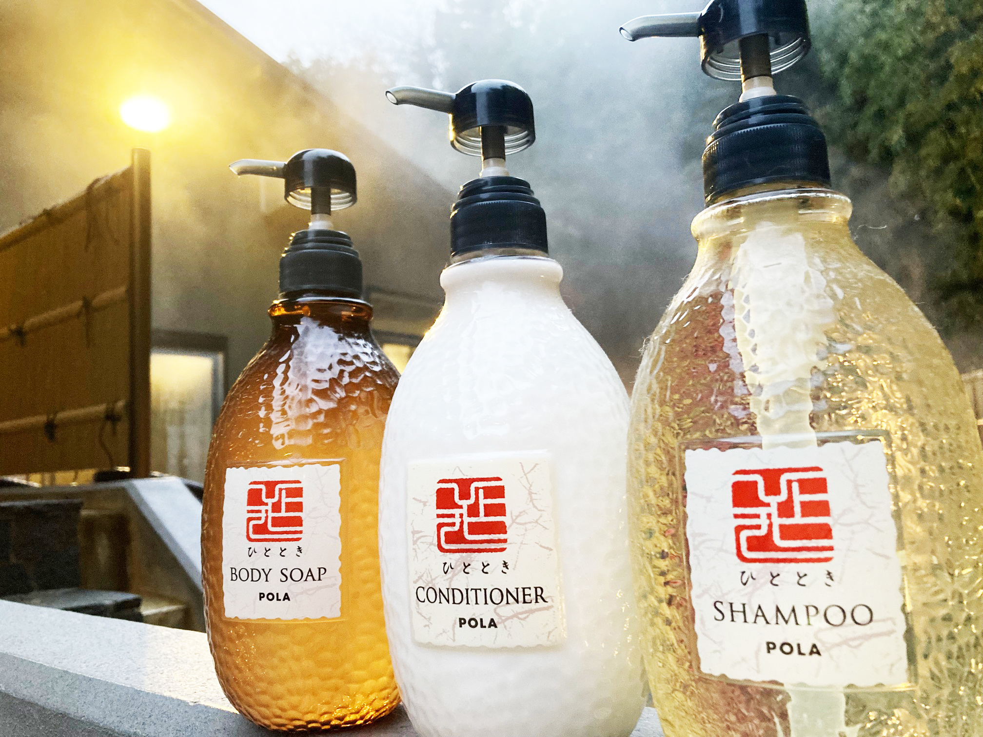国産成分にこだわった「POLAひとときシリーズ」アメニティを男女洗い場ブースの一部に設置します。