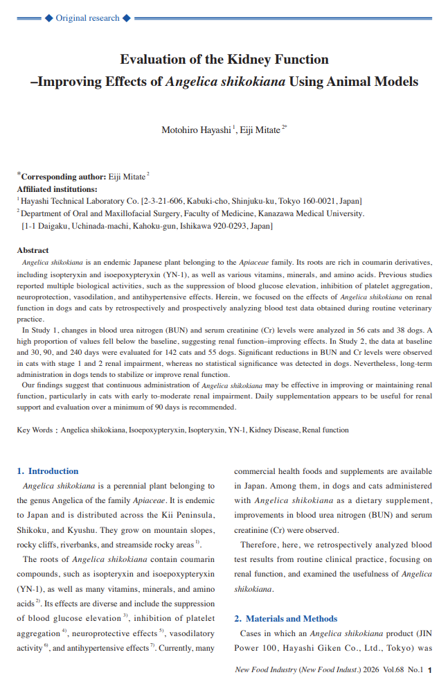 林技研株式会社(本社:東京都新宿区、代表取締役:林 基弘)は、同社が研究・取り扱いを行う植物素材「イヌトウキ(Angelica shikokiana)」に関する研究論文が、査読付き学術誌『New Food Industry(2026年1月号)』の巻頭に掲載されたことをお知らせいたします。