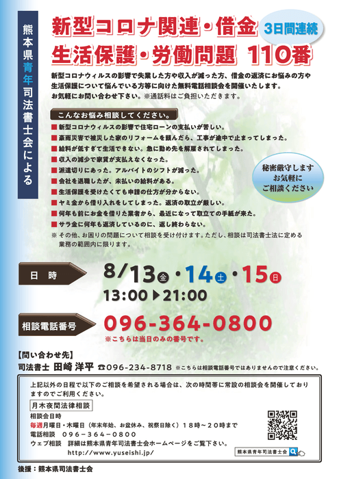 熊本県青年司法書士会では、多重債務問題等に悩む方々に向けて、司法書士による「新型コロナ・借金・生活保護・労働問題110番」を、2021年8月13日(金)から8月15日(日)まで3日間連続で開催いたします。