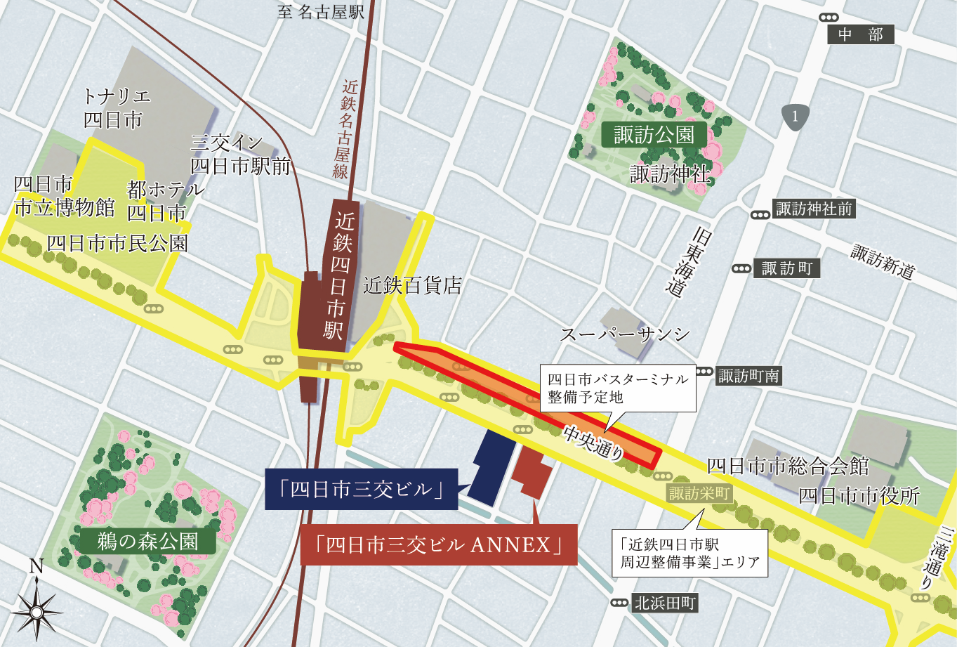 ・計画地は、近鉄四日市駅から徒歩3分に位置し、近鉄四日市駅とJR四日市駅を結ぶメインストリート「中央通り」に面しています。四日市駅前周辺では、国の「バスタプロジェクト」や四日市市の「近鉄四日市駅前周辺等整備事業」により、円形デッキ「よんまるテラス」も供用開始され、整備工事が進行中です。今後ビジネス・レジャー双方の拠点として高い利便性を備えるエリアです。