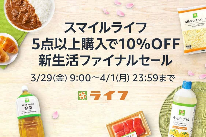 このたび、2024年3月29日(金)9時00分から4月1日(月)23時59分までの4日間Amazonで開催される「Amazon 新生活SALE FINAL」に合わせ、Amazon上のライフネットスーパーにおきましても「新生活ファイナルセール スマイルライフ5点以上購入で10%OFF」を開催いたします。