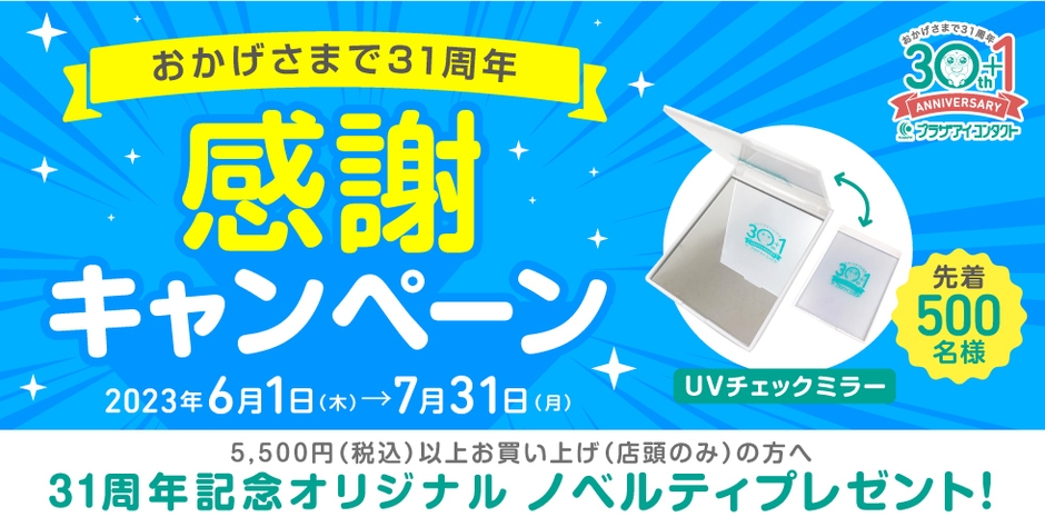 5月28日(日)で31周年を迎えたコンタクトレンズ専門店 プラザアイ コンタクトでは、プラザアイ コンタクト全店舗で5,500円(税込)以上お買い上げのお客様へ、プラザアイ コンタクト31周年記念オリジナルUVチェックミラーを先着500名様にプレゼント!