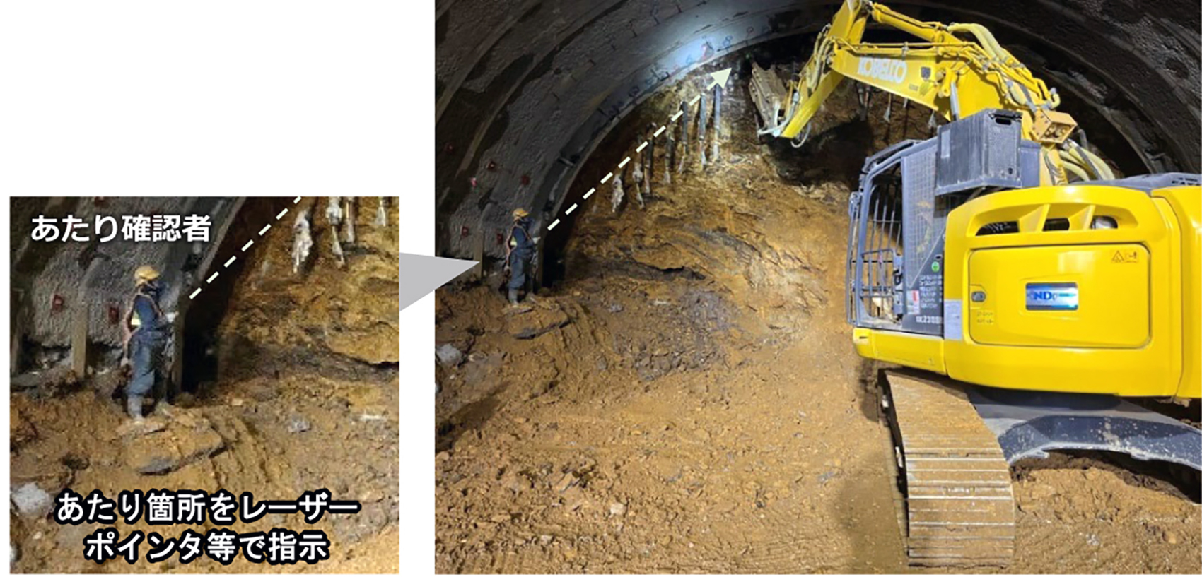山岳トンネル工事では、発破後に生じる切羽岩盤の凸凹に対し、設計断面から飛び出た箇所(あたり)をブレーカーショベルで除去する、あたり取り作業が行われます。従来、この作業は、重機のオペレータと作業員の2名で行いますが、掘削直後に切羽付近で目視確認を行う必要があるため、肌落ち災害のリスクが問題となっています(図1)。