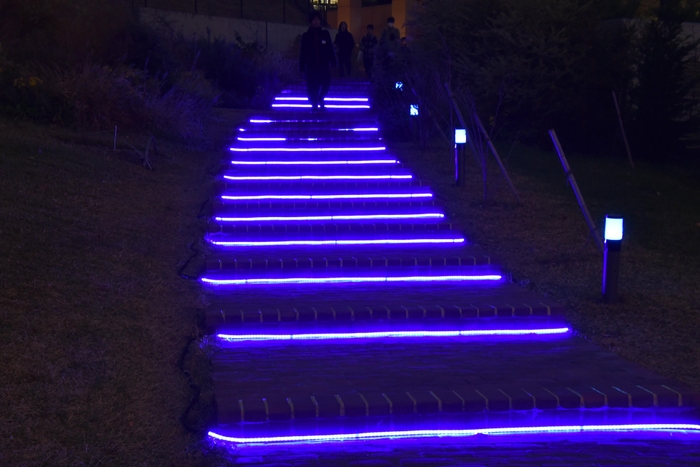 「青色ライトアップ」は午後5時から8時までの3時間にわたって、研究実験棟Ⅳの外壁にプロジェクターで赤﨑、天野両特別栄誉教授の似顔絵や「光の三原色」をイメージした映像などを浮かび上がらせたほか、中庭(トチノキ広場)の階段状になっている通路をライトアップで青色に染め上げました。寒さも忘れて幻想的に浮かび上がった光景を見た学生たちや教職員からは「へえ、すごい!」「青色がきれいに映っている」との声が上がり、学生の1人は「この10年でLEDが私たちの暮らしに広く普及して、時代が1つ変わったのではと感じています」と話していました。