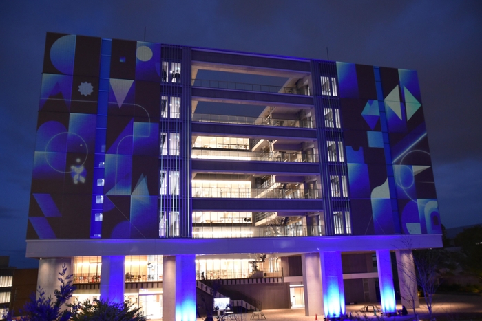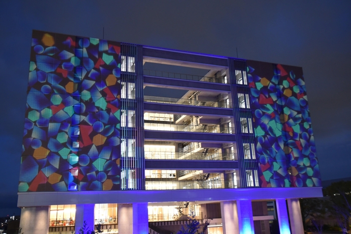 研究実験棟Ⅳの壁面に幻想的な光の映像が浮かび 周辺をブルーに染める