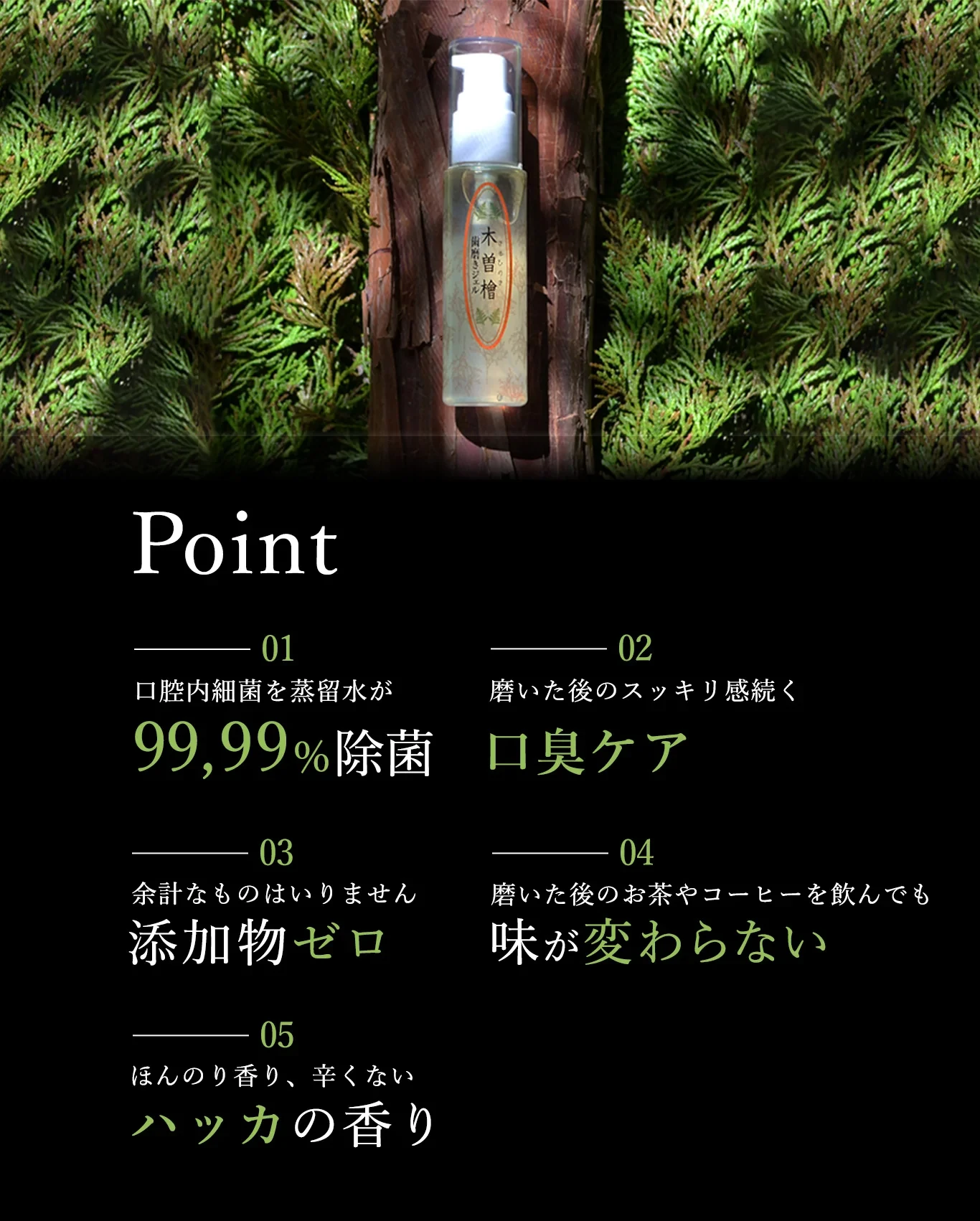 天然木曽檜の蒸留水から偶然生まれたこの歯磨きジェルは、歯周病菌や虫歯菌、口内炎の原因となる菌を99.99%除菌する力が科学的に確認されています。