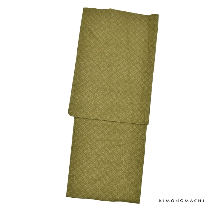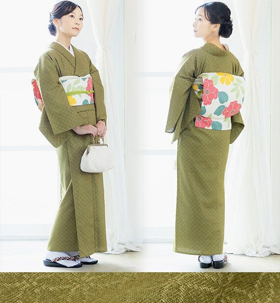 落ち着いた黄緑色の地に、織りで表現された七宝文様が全体に表現されています。一見、無地に見える着物は、帯や合わせるアイテムによって大きくイメージが変わります。落ち着いたグリーンが春コーデにピッタリです。