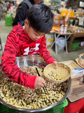制限時間30秒で渋川市産の香ばしくて甘い殻付き落花生を、お箸でつまみ、ザルかごへポンポン移動!シンプルなのに、気づけば大人も子どもも本気モードに。