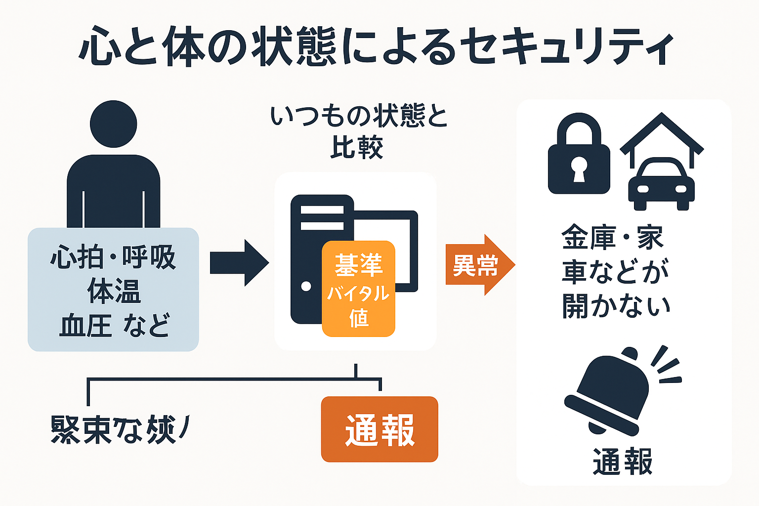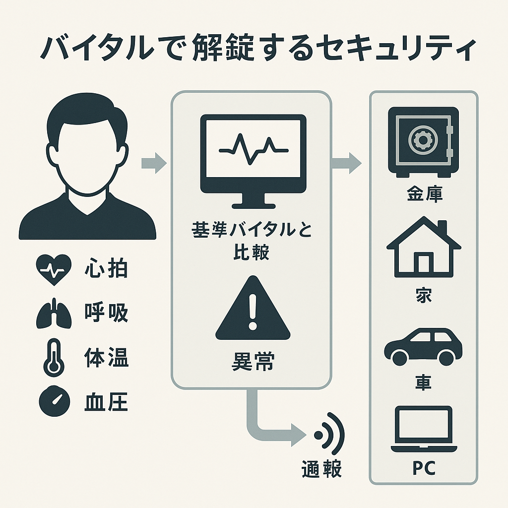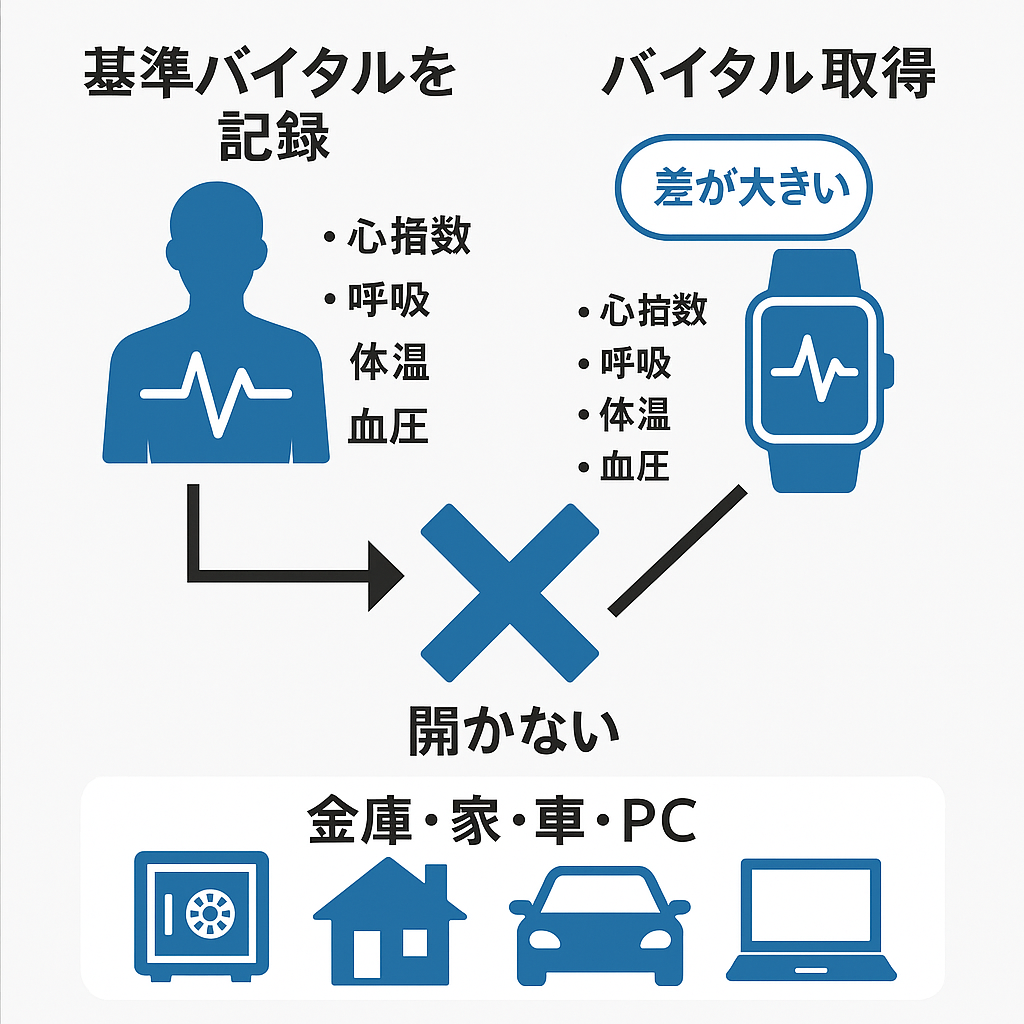 「本人が操作できる状況でも、“いつもと違うバイタル状態”なら解除・実行を止める」= 強要・異常状態での不正実行を抑止