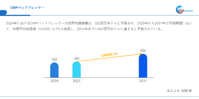 QYResearchが発表した新たな市場調査レポート「CMPパッドドレッサー―グローバル市場シェアとランキング、全体の売上と需要予測、2026~2032」によると、世界のCMPパッドドレッサー市場規模は2024年の約320百万米ドルから2025年の340百万米ドルへと順調に拡大すると見込まれ、予測期間中は年平均成長率(CAGR)6.7%で成長し、2031年には502百万米ドルに達すると予測されている。