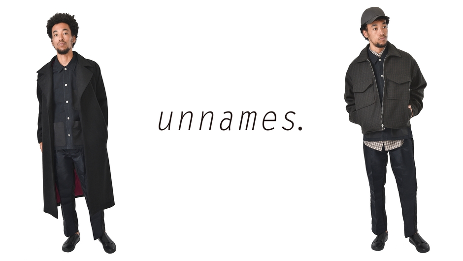 そのブランドの定義である「真に衣服を通じたその人の表現したい世界を目に視え、手に触れ、人を彩る役割を担いたい」の想いから生まれたのが、オリジナルカジュアルウェア『unnames.』。ファストファッション全盛の時代だからこそコストを衣服に懸ける意味性を取り戻し、テーラーの経験を入れた独自のシルエットとトレンドに左右されない良いものを創るという気概で、アパレルを知り尽くしたプロフェッショナルに選ばれる日常の一着を本年12月6日より提供してまいります。