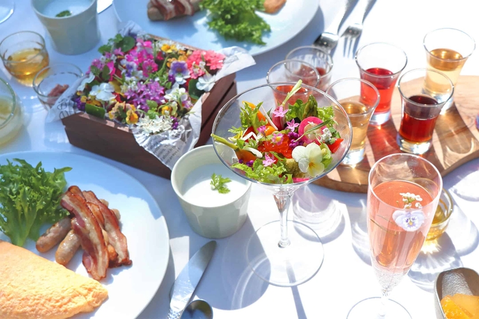 春の花をテーマに、さまざまな方法で花を楽しめる朝食です。乾杯の飲み物では、カーネーション含む4種類のフラワービネガーから好みのものを選び、炭酸水で割った「フラワーサイダー」。食事では、アカシアの花が蜜源植物のハチミツを使用したドレッシングや、コブシの花を丸ごと蜜に漬け込み、香りづけたシロップなどを使用して、花の香りを楽しめます。それぞれの春の花が持つ華やかな香りを堪能できる朝食です。