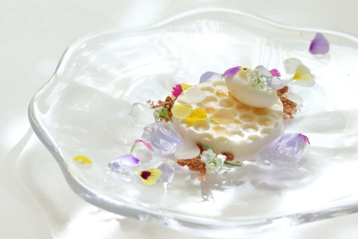 食後のデザートとして、花のスイーツとカーネーションの工芸茶を提供します。花のスイーツは、栗の花のハチミツを使用した麹甘酒のブランマンジェです。ラベンダーやエルダーフラワーのジュレ、レモンのコンフィチュールを添えているので、華やかな香りと甘酸っぱい味わい。お湯を注ぐとゆっくりと花開く、カーネーションの工芸茶と一緒に楽しめます。食事が終わった後も、花を楽しみつくすひとときです。