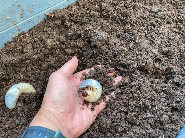 この夏に卵から孵ったかぶと虫の幼虫は、腐葉土や木くずの中で秋には体長3cm程度の大きさまで育ち、更に成長を続けています。成虫のかぶと虫とは違い、日頃は目にする機会も少ない幼虫の様子を、木くずの中からそっと掘り出して観察することができます。