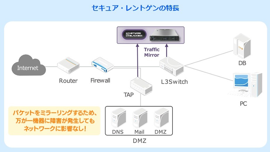 ネットワーク機器のミラーポートを利用して診断を行うため、既存環境や業務システムに影響を与えることなく、安全に導入できます。