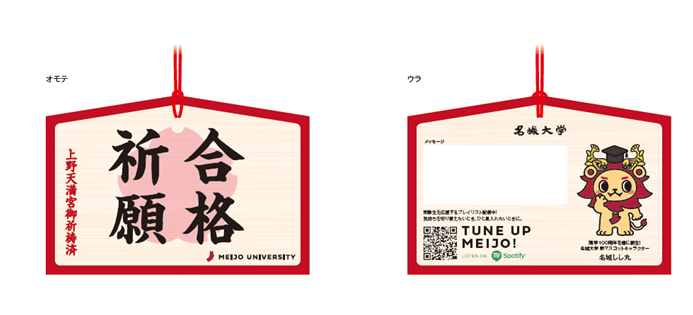 ・2025年9月16日~10月30日に、本学在学生らに「毎日を明るくしてくれる曲」「聴くと元気が出る曲」を募集し、寄せられた全107件から、厳選した29曲を「TUNE UP MEIJO」としてプレイリスト化。「絵馬カード」の裏面のQRコードを読み込むと誰でも聴くことが可能。