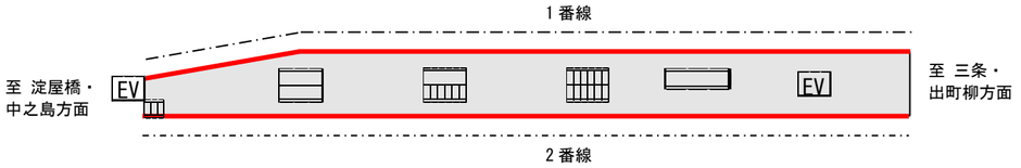 京阪本線 京橋駅 1・2番線ホーム(京都方面行きホーム)(赤線部分が可動式ホーム柵設置個所)