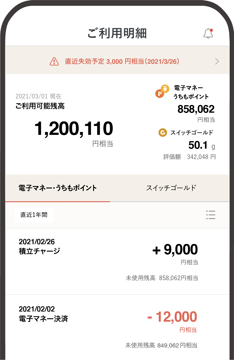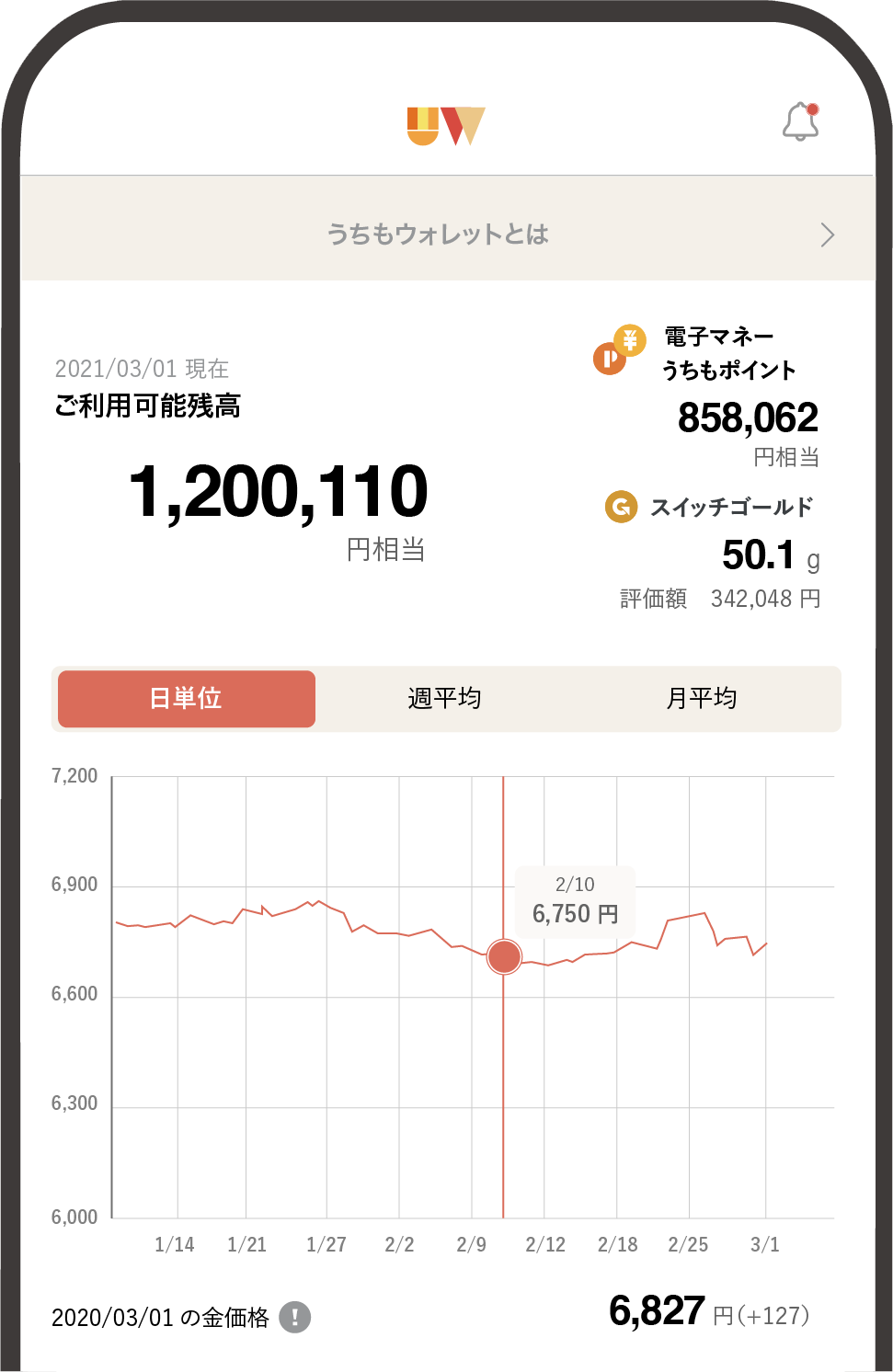 「うちもウォレット」アプリでは、うちもウォレットの残高や利用履歴の確認、積立チャージやスポットチャージの手続き、電子ゴールドの購入・売却など、これまで以上にうちもウォレットを手軽に利用できます。