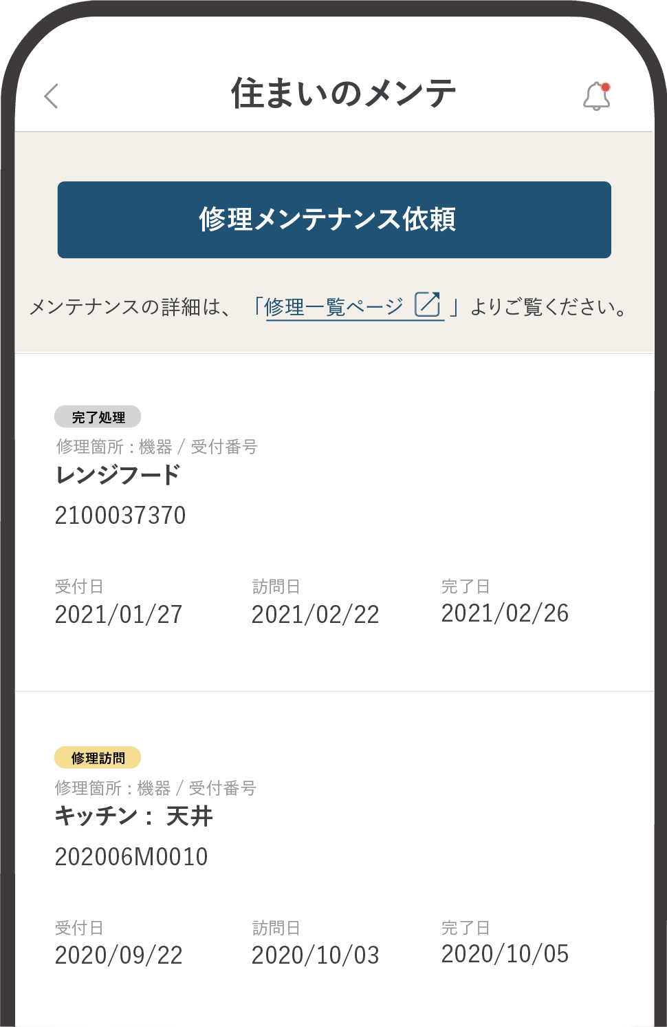 また、うちも会員のアカウント情報はもちろん、当社にご依頼いただいた住まいのメンテナンス・修理の履歴やステータス確認なども行えます(アプリの利用には、うちも会員登録[無料]が必要です。)。