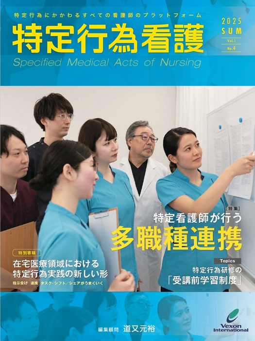 ヴェクソンインターナショナル株式会社では、特定看護師をはじめとする特定行為に関わるすべての医療従事者をサポートするため、年4回の季刊誌『特定行為看護』を発行しています。最新の制度動向、現場の実践事例、スキルアップ情報など、特定行為に関する“今”を凝縮してお届けする唯一の専門情報誌です!