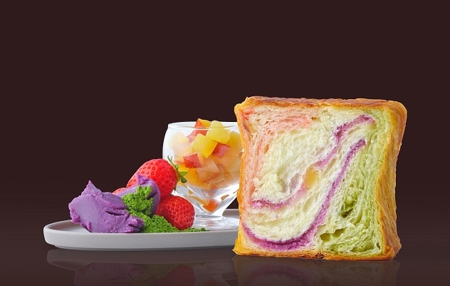 「何層にも織り重ねる」が十二単とマーブルデニッシュのキーワード。マーブルデニッシュは、生地を何層にも重ねることでふんわりとした食感を生み出しています。生地の層の間に色を重ねるグランマーブル初の試みにより、「十二単」の華やかさを表現。デニッシュ生地に、いちご、宇治抹茶、むらさきいも餡、国産の鳴門金時の甘露煮を織り込み、ほんのりと甘く仕上げました。優雅な装いをまとった新商品をお届けいたします。