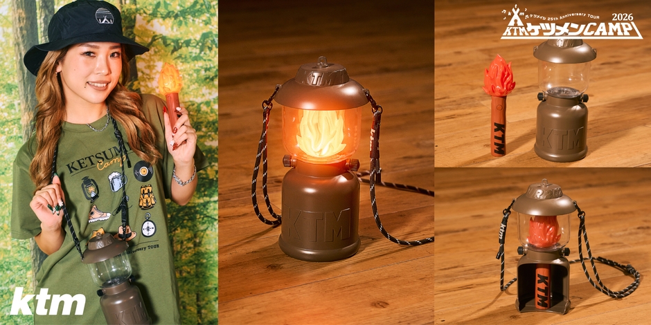今回は本ツアーのテーマである「キャンプ」を楽しむオフィシャルグッズを多数ご用意しました。松明としても使用できる取り外し可能なランタン型ペンライトをはじめ、オリジナルカラビナ、ギアベストとしても活用できるマルチポケットバッグ、撥水加工を施したバケットハット、テント型ティッシュケースなど、デザイン性と実用性を兼ね備え、実際のキャンプシーンでもお使いいただけるグッズが揃っております。