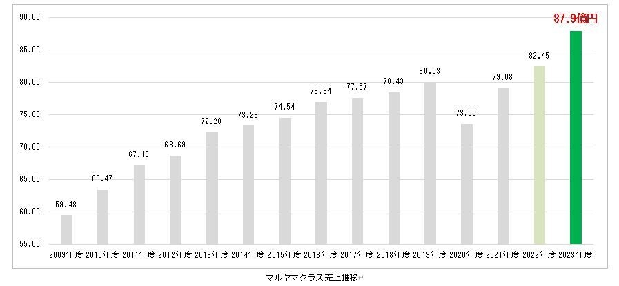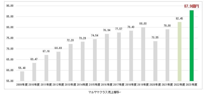 マルヤマクラスは2009年に開業、開業初年度の年商59.5億円以降、10年連続で増収し2019年度には80億円を突破。新型コロナウイルス禍を経て2022年度には2019年度の最高売上を更新し、2023年度も前年比106.6%と大きく記録を更新、2024年3月度時点では単月ごとの過去最高売上を16か月連続で記録している。