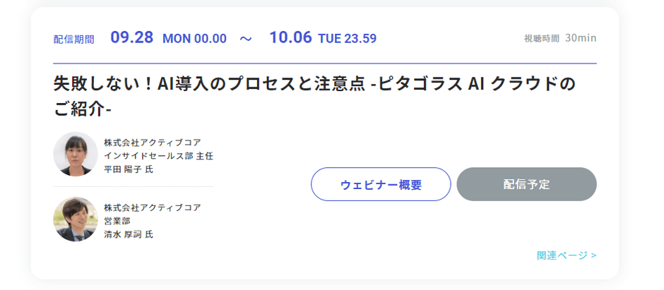 アクティブコアの企業展示ブースでは、「ピタゴラス AI」のサービス説明や特長、さらには3分で分かるデモ動画シリーズを公開しています。詳細資料のダウンロードやもっとサービスについて聞きたい方はサイトからアポのご依頼やお問合せが可能となっています。また、「どのようにAI導入を進めればよいか分からない」という方のために、アクティブコアでは30分のウェビナーも期間限定(9/28~10/6)で配信予定です。