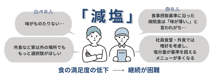 しかし、従来の減塩対策は「味が薄い」「食事が楽しくない」という課題があり 、食事を提供する側にとっても嗜好を考慮する難しさがありました 。