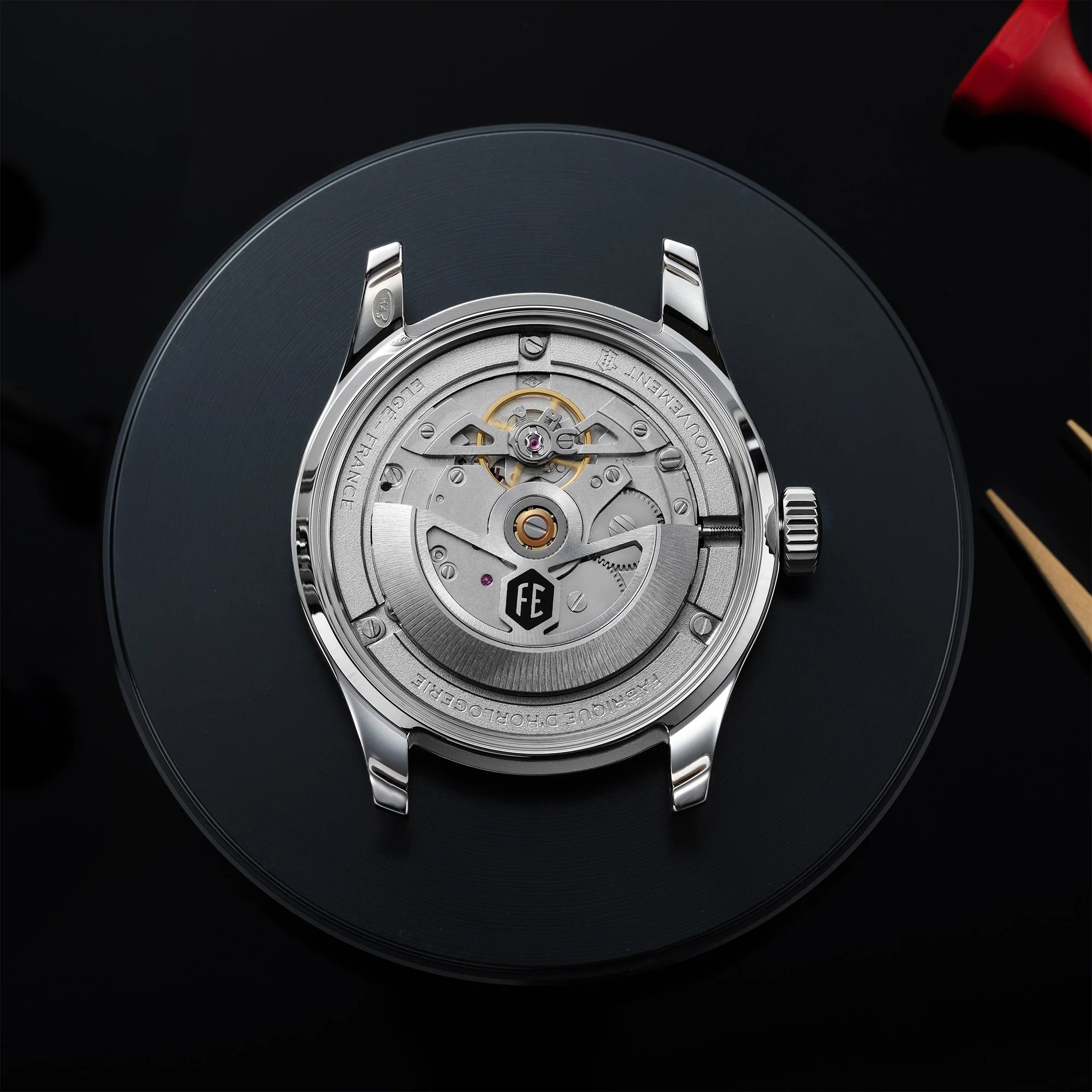 Elgéの最大の特徴は、フランス製ムーブメントの採用にあります。現在主流となっているスイス製ムーブメントに依存せず、フランス国内で生産される機械式ムーブメントを搭載。組み立て・調整もフランスで行うことで、真に「フランス製」と呼べる時計づくりを実現しています。この姿勢は、単なるスペックではなく、ブランドの哲学そのものを体現しています。